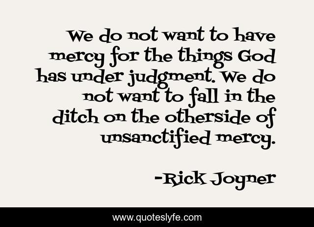 This page presents the quote "We do not want to have mercy for the things God has under judgment. We do not want to fall in the ditch on the otherside of unsanctified mercy.". Author of this quote is Rick Joyner. This quote is about mercy, judgment, love, affection, sanctification,.