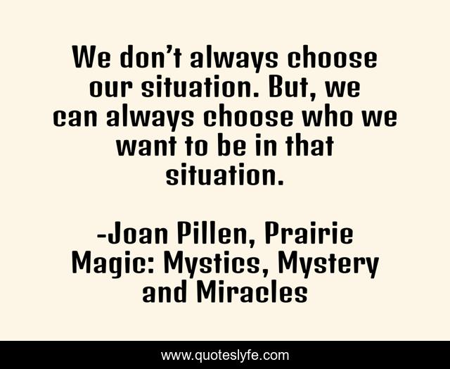 "Joan Pillen, Prairie Magic: Mystics, Mystery and Miracles Quotes." Quoteslyfe.com, 2025. Fri. 05 Dec. 2025. <https://www.quoteslyfe.com/quote/We-don-t-always-choose-our-situation-172351>.