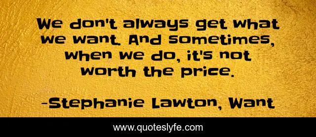 This page presents the quote "We don't always get what we want. And sometimes, when we do, it's not worth the price.". Author of this quote is Stephanie Lawton, Want. This quote is about new-adult, contemporary-romance, southern-fiction,.