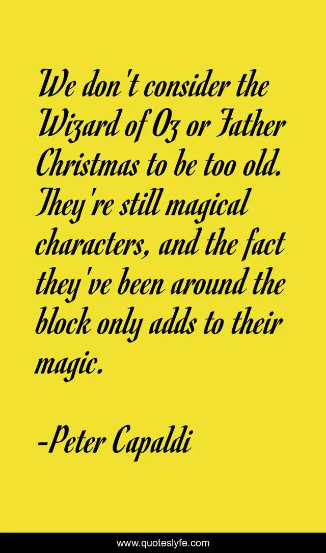 This page presents the quote "We don't consider the Wizard of Oz or Father Christmas to be too old. They're still magical characters, and the fact they've been around the block only adds to their magic.". Author of this quote is Peter Capaldi. This quote is about father, magic, magical,.