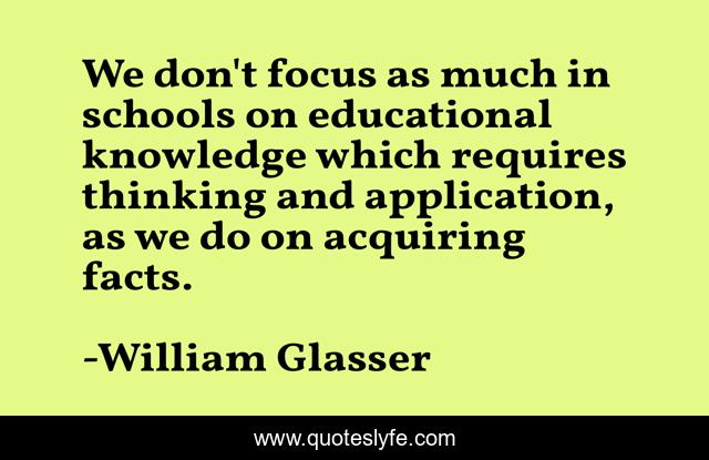 This page presents the quote "We don't focus as much in schools on educational knowledge which requires thinking and application, as we do on acquiring facts.". Author of this quote is William Glasser. This quote is about thinking, facts, focus,.