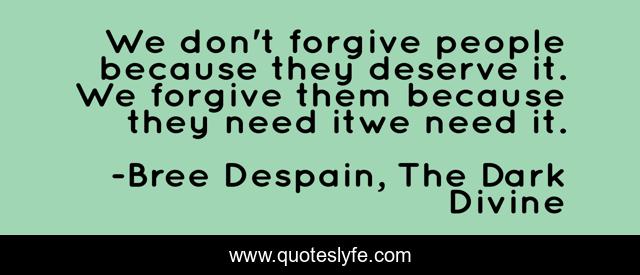 This page presents the quote "We don't forgive people because they deserve it. We forgive them because they need itwe need it.". Author of this quote is Bree Despain, The Dark Divine. This quote is about forgiveness, pastor-divine, dark-divine,.