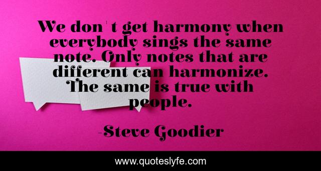 This page presents the quote "We don't get harmony when everybody sings the same note. Only notes that are different can harmonize. The same is true with people.". Author of this quote is Steve Goodier. This quote is about opinions, differences, agreement, different-perspective, conflict-resolution, getting-along, conflict, harmony,.