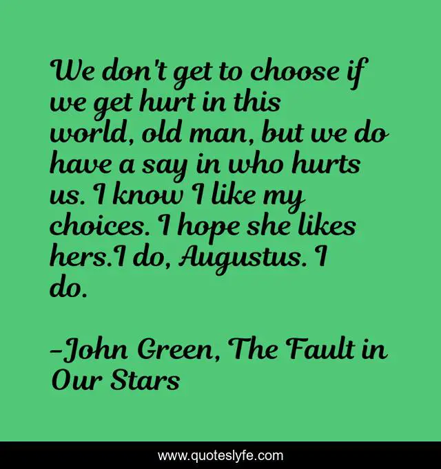 This page presents the quote "We don't get to choose if we get hurt in this world, old man, but we do have a say in who hurts us. I know I like my choices. I hope she likes hers.I do, Augustus. I do.". Author of this quote is John Green, The Fault in Our Stars. This quote is about the-fault-in-our-stars, love, philosophy, sad, heartbreaking, hope, choices, affection,.