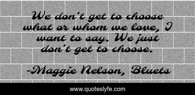 This page presents the quote "We don't get to choose what or whom we love, I want to say. We just don't get to choose.". Author of this quote is Maggie Nelson, Bluets. .