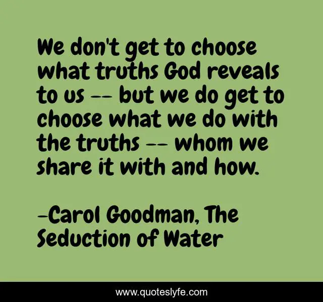 This page presents the quote "We don't get to choose what truths God reveals to us -- but we do get to choose what we do with the truths -- whom we share it with and how.". Author of this quote is Carol Goodman, The Seduction of Water. This quote is about revelation, truth, choice,.