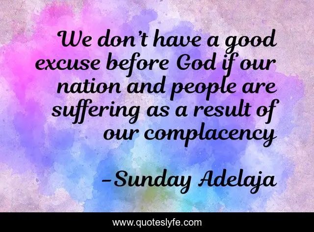 This page presents the quote "We don’t have a good excuse before God if our nation and people are suffering as a result of our complacency". Author of this quote is Sunday Adelaja. This quote is about good, complacency, god, nation, excuse, suffering,.
