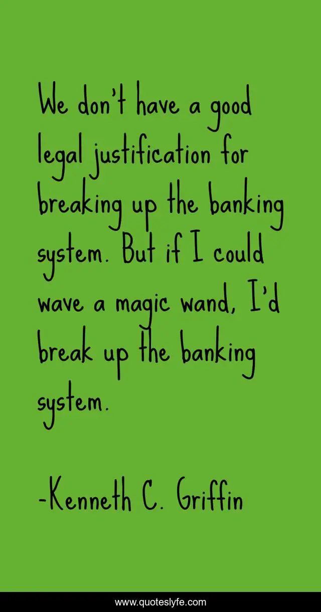 This page presents the quote "We don't have a good legal justification for breaking up the banking system. But if I could wave a magic wand, I'd break up the banking system.". Author of this quote is Kenneth C. Griffin. This quote is about good, magic, wave,.