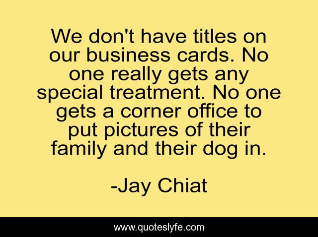 This page presents the quote "We don't have titles on our business cards. No one really gets any special treatment. No one gets a corner office to put pictures of their family and their dog in.". Author of this quote is Jay Chiat. This quote is about cards, dog, family,.
