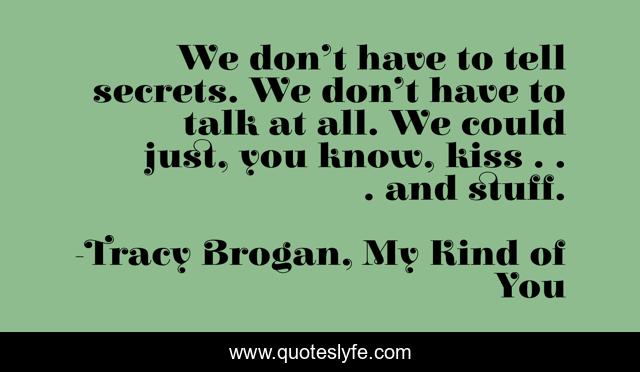 This page presents the quote "We don’t have to tell secrets. We don’t have to talk at all. We could just, you know, kiss . . . and stuff.". Author of this quote is Tracy Brogan, My Kind of You. This quote is about small-town-romance, contemporary-romance,.
