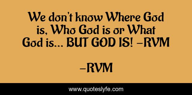 This page presents the quote "We don't know Where God is, Who God is or What God is… BUT GOD IS! -RVM". Author of this quote is RVM. This quote is about motivation, inspiration,.