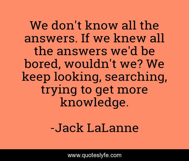 This page presents the quote "We don't know all the answers. If we knew all the answers we'd be bored, wouldn't we? We keep looking, searching, trying to get more knowledge.". Author of this quote is Jack LaLanne. This quote is about looking, trying,.