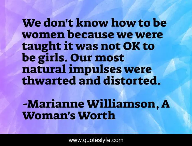 This page presents the quote "We don't know how to be women because we were taught it was not OK to be girls. Our most natural impulses were thwarted and distorted.". Author of this quote is Marianne Williamson, A Woman's Worth. This quote is about marianne-williamson, girls, women,.