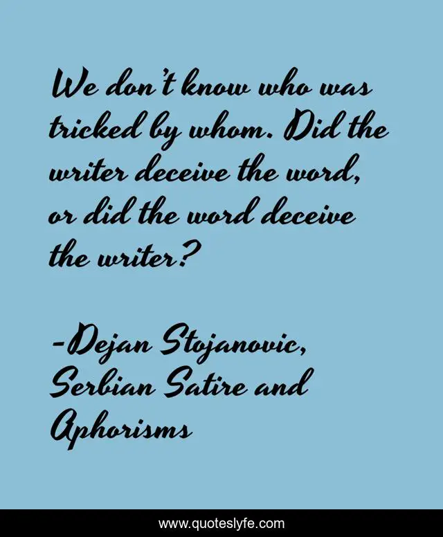This page presents the quote "We don’t know who was tricked by whom. Did the writer deceive the word, or did the word deceive the writer?". Author of this quote is Dejan Stojanovic, Serbian Satire and Aphorisms. This quote is about dejan-stojanovic, writers, deceiving, words,.