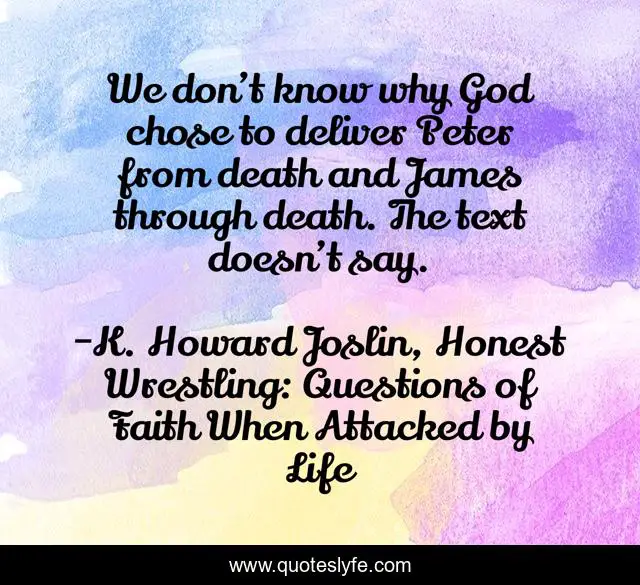 This page presents the quote "We don’t know why God chose to deliver Peter from death and James through death. The text doesn’t say.". Author of this quote is K. Howard Joslin, Honest Wrestling: Questions of Faith When Attacked by Life. This quote is about faith, endurance, martyrs, deliverance, death,.
