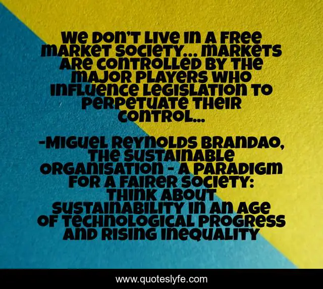 This page presents the quote "We don’t live in a free market society… markets are controlled by the major players who influence legislation to perpetuate their control...". Author of this quote is Miguel Reynolds Brandao, The Sustainable Organisation - a paradigm for a fairer society: Think about sustainability in an age of technological progress and rising inequality. This quote is about free-markets, stock-market, capitalism, economy,.