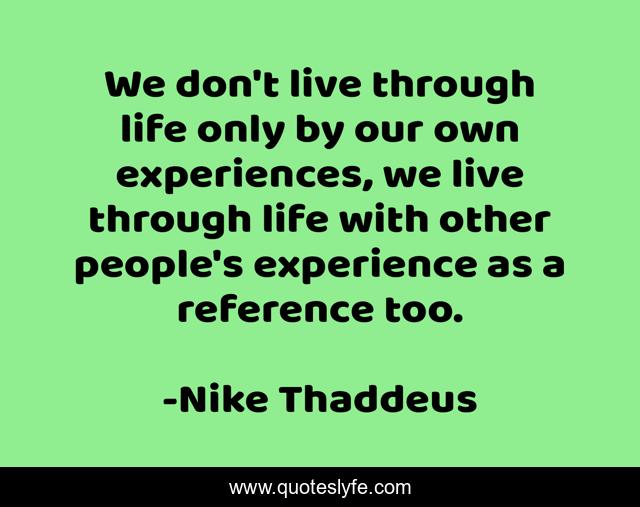 This page presents the quote "We don't live through life only by our own experiences, we live through life with other people's experience as a reference too.". Author of this quote is Nike Thaddeus. This quote is about relationships, life, sharing, learning-from-mistakes, experience, learning,.