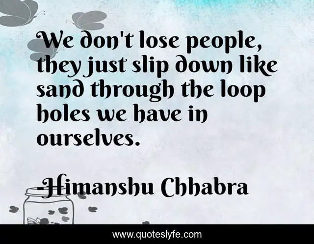 This page presents the quote "We don't lose people, they just slip down like sand through the loop holes we have in ourselves.". Author of this quote is Himanshu Chhabra. This quote is about loss, loopholes,.