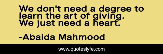 This page presents the quote "We don't need a degree to learn the art of giving. We just need a heart.". Author of this quote is Abaida Mahmood. This quote is about giving, helping, sharing,.