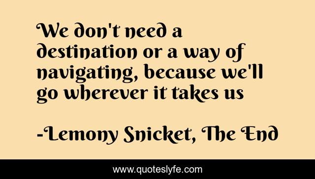 This page presents the quote "We don't need a destination or a way of navigating, because we'll go wherever it takes us". Author of this quote is Lemony Snicket, The End. .