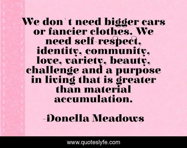 This page presents the quote "We don't need bigger cars or fancier clothes. We need self-respect, identity, community, love, variety, beauty, challenge and a purpose in living that is greater than material accumulation.". Author of this quote is Donella Meadows. This quote is about challenge, love, community, affection,.