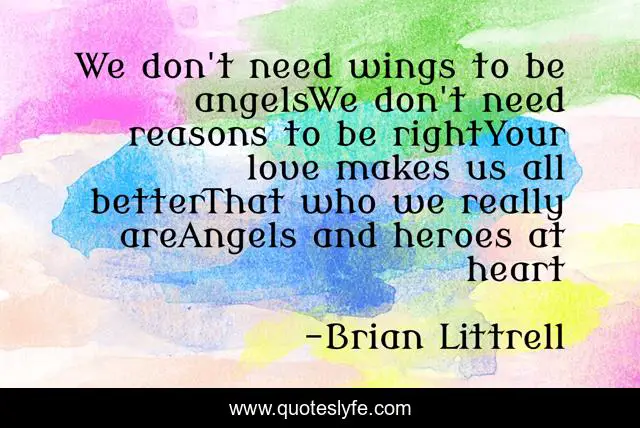 This page presents the quote "We don't need wings to be angelsWe don't need reasons to be rightYour love makes us all betterThat who we really areAngels and heroes at heart". Author of this quote is Brian Littrell. This quote is about etc, heroes, love, angels, affection,.