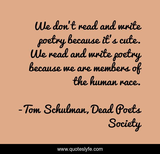 This page presents the quote "We don't read and write poetry because it's cute. We read and write poetry because we are members of the human race.". Author of this quote is Tom Schulman, Dead Poets Society. .