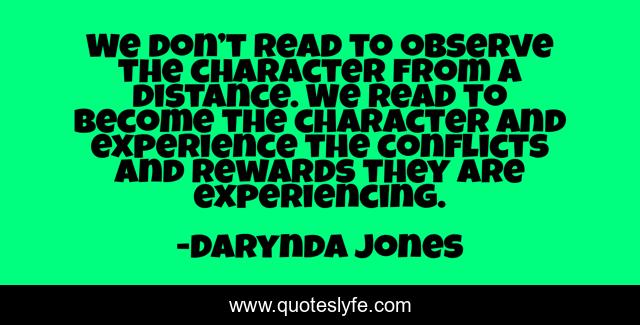 This page presents the quote "We don’t read to observe the character from a distance. We read to become the character and experience the conflicts and rewards they are experiencing.". Author of this quote is Darynda Jones. This quote is about writing, ruby-slippered-sisterhood, the-secret-to-winning, writing-advice,.