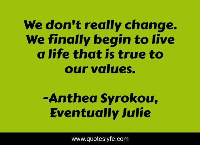 This page presents the quote "We don't really change. We finally begin to live a life that is true to our values.". Author of this quote is Anthea Syrokou, Eventually Julie. This quote is about confidence, beauty, positive, motivational, contemporary, wisdom, romance, optimistic, inspirational,.