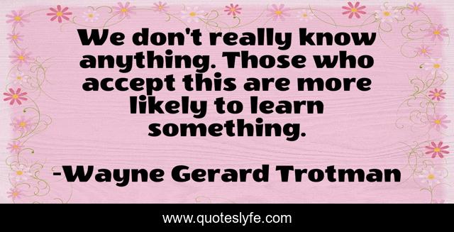 This page presents the quote "We don't really know anything. Those who accept this are more likely to learn something.". Author of this quote is Wayne Gerard Trotman. This quote is about learning, knowledge, learning-process, humility,.