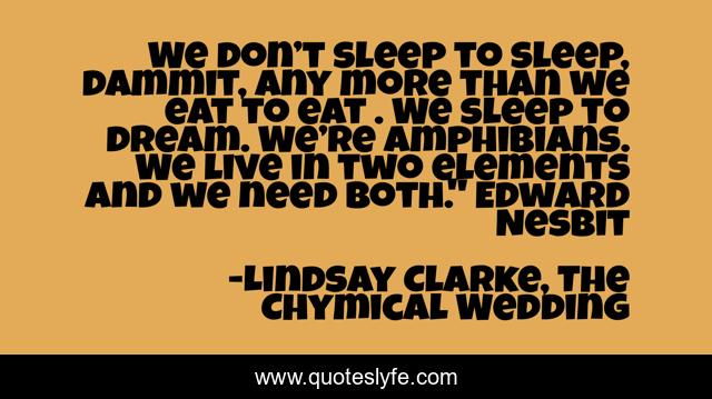This page presents the quote "We don’t sleep to sleep, dammit, any more than we eat to eat . We sleep to dream. We’re amphibians. We live in two elements and we need both." Edward Nesbit". Author of this quote is Lindsay Clarke, The Chymical Wedding. This quote is about life-philosophy, lindsay-clarke, dream, the-chymical-wedding, sleep,.