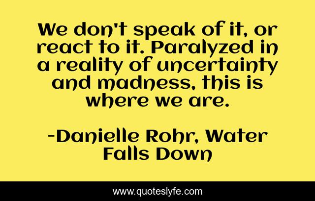 This page presents the quote "We don't speak of it, or react to it. Paralyzed in a reality of uncertainty and madness, this is where we are.". Author of this quote is Danielle Rohr, Water Falls Down. This quote is about teens, suicide, depression, yosemite,.