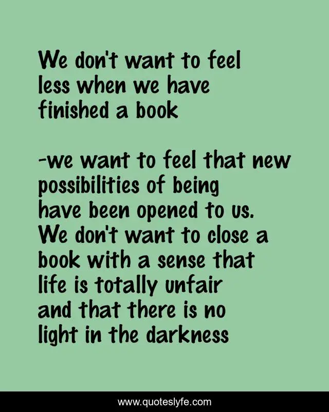 "we want to feel that new possibilities of being have been opened to us. We don't want to close a book with a sense that life is totally unfair and that there is no light in the darkness Quotes." Quoteslyfe.com, 2025. Fri. 05 Dec. 2025. <https://www.quoteslyfe.com/quote/We-don-t-want-to-feel-less-66510>.