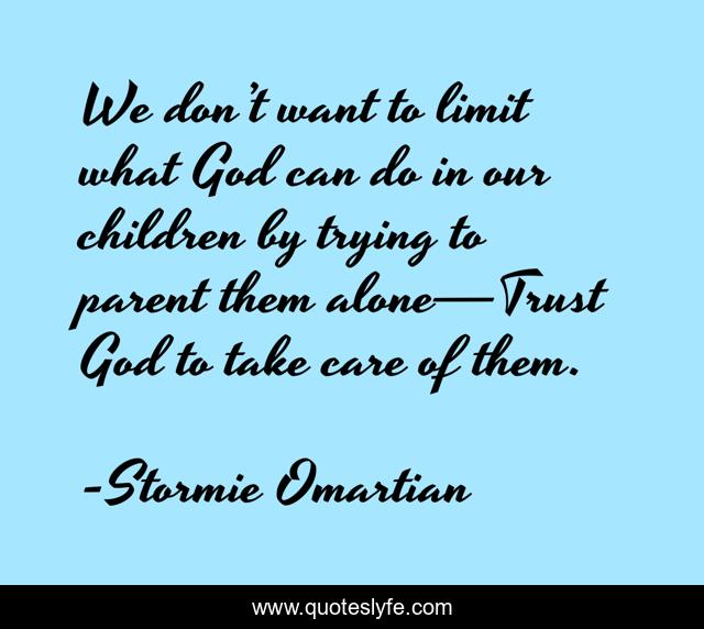This page presents the quote "We don’t want to limit what God can do in our children by trying to parent them alone—Trust God to take care of them.". Author of this quote is Stormie Omartian. This quote is about motivation, christian, uplifting, powerful, encouraging, encouragement, jesus, spirituality, prayer,.
