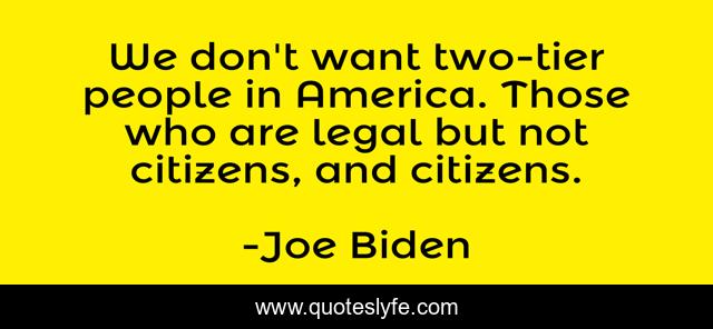 This page presents the quote "We don't want two-tier people in America. Those who are legal but not citizens, and citizens.". Author of this quote is Joe Biden. This quote is about america, people,.