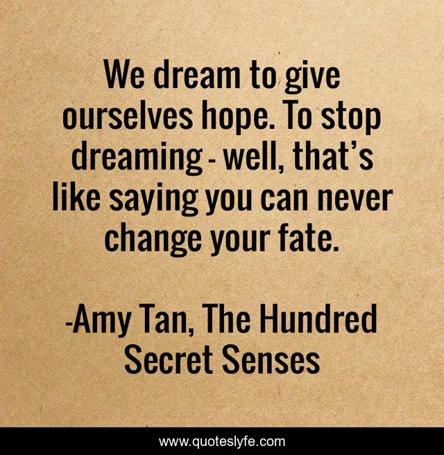 "Amy Tan, The Hundred Secret Senses Quotes." Quoteslyfe.com, 2025. Tue. 09 Dec. 2025. <https://www.quoteslyfe.com/quote/We-dream-to-give-ourselves-hope-To-19142>.