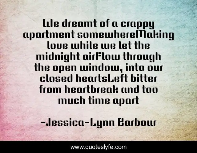 This page presents the quote "We dreamt of a crappy apartment somewhereMaking love while we let the midnight airFlow through the open window, into our closed heartsLeft bitter from heartbreak and too much time apart". Author of this quote is Jessica-Lynn Barbour. This quote is about life, literature, love, author, willow, writer, poetry, lust, quotes,.