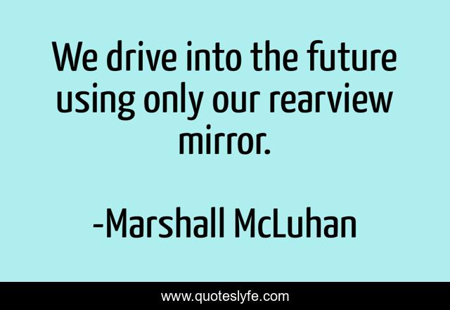 This page presents the quote "We drive into the future using only our rearview mirror.". Author of this quote is Marshall McLuhan. This quote is about mirror, rearview, drive,.