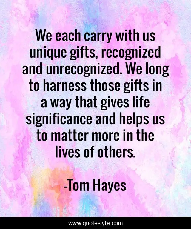 This page presents the quote "We each carry with us unique gifts, recognized and unrecognized. We long to harness those gifts in a way that gives life significance and helps us to matter more in the lives of others.". Author of this quote is Tom Hayes. This quote is about life, unique-gifts, success, matter-more, success-self-improvement, mattering, relevance, meaning, success-strategies,.