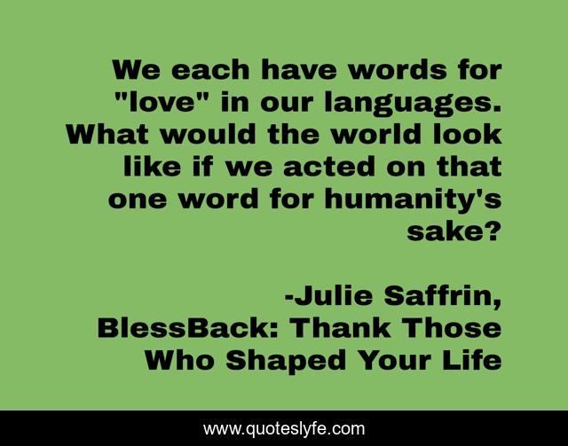 This page presents the quote "We each have words for "love" in our languages. What would the world look like if we acted on that one word for humanity's sake?". Author of this quote is Julie Saffrin, BlessBack: Thank Those Who Shaped Your Life. This quote is about love, goodness, affection,.