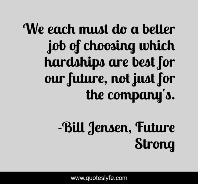 This page presents the quote "We each must do a better job of choosing which hardships are best for our future, not just for the company's.". Author of this quote is Bill Jensen, Future Strong. This quote is about enthusiasm, future, leadership, inspirational, self-help,.