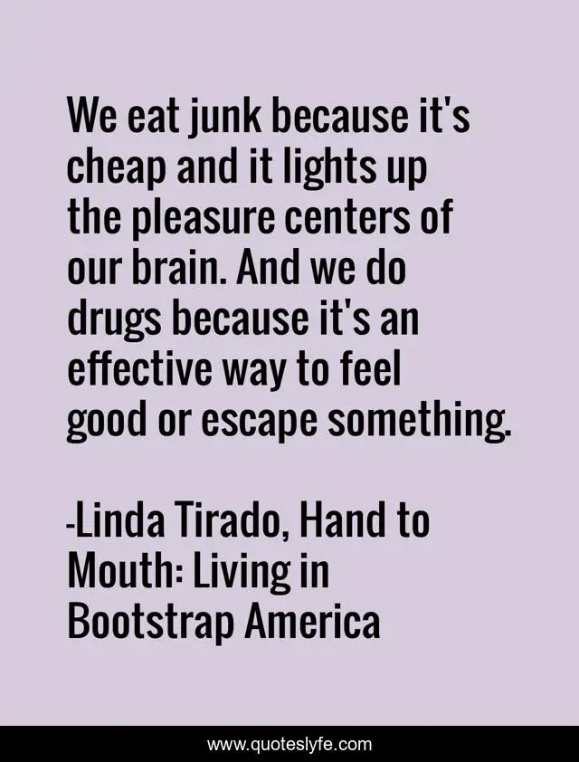 This page presents the quote "We eat junk because it's cheap and it lights up the pleasure centers of our brain. And we do drugs because it's an effective way to feel good or escape something.". Author of this quote is Linda Tirado, Hand to Mouth: Living in Bootstrap America. This quote is about drugs, pleasure, junk-food, poverty,.