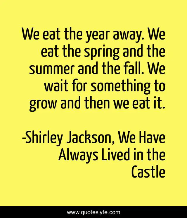 This page presents the quote "We eat the year away. We eat the spring and the summer and the fall. We wait for something to grow and then we eat it.". Author of this quote is Shirley Jackson, We Have Always Lived in the Castle. .