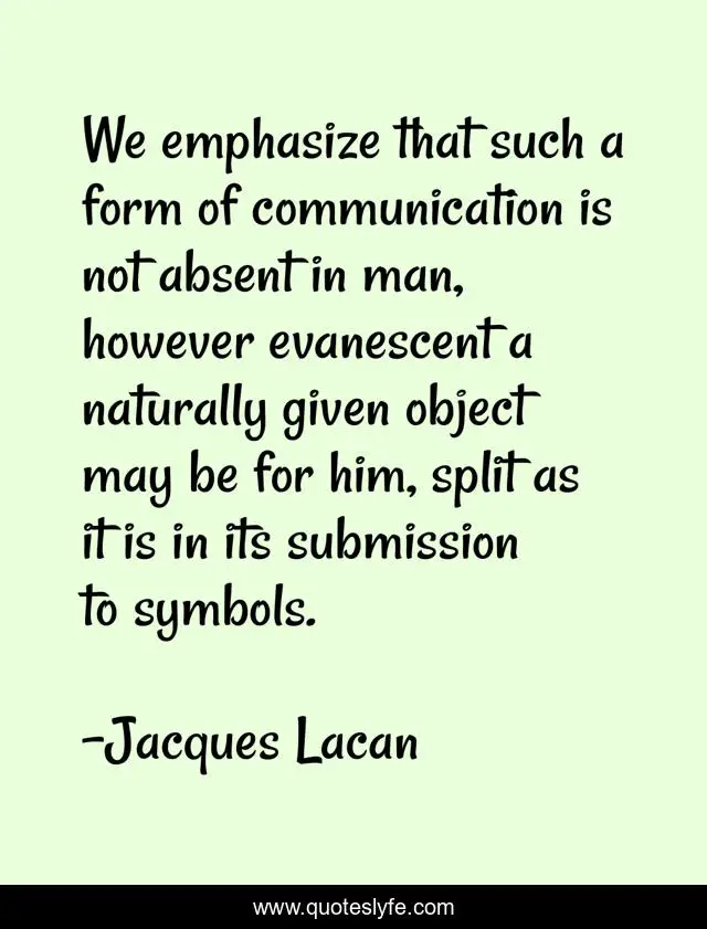 This page presents the quote "We emphasize that such a form of communication is not absent in man, however evanescent a naturally given object may be for him, split as it is in its submission to symbols.". Author of this quote is Jacques Lacan. This quote is about symbols, him, man,.