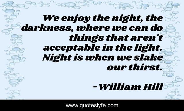 This page presents the quote "We enjoy the night, the darkness, where we can do things that aren't acceptable in the light. Night is when we slake our thirst.". Author of this quote is William Hill. .