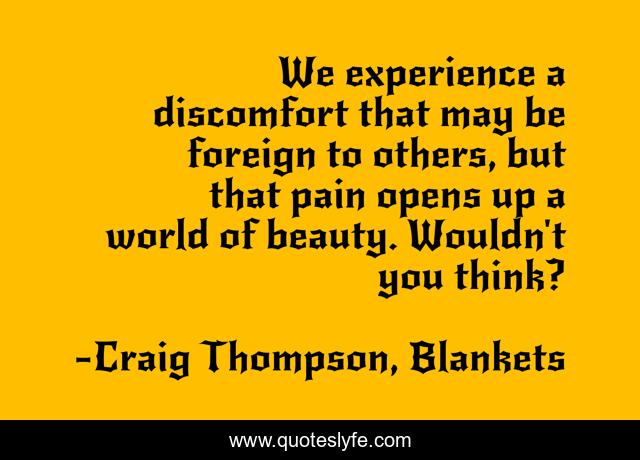 This page presents the quote "We experience a discomfort that may be foreign to others, but that pain opens up a world of beauty. Wouldn't you think?". Author of this quote is Craig Thompson, Blankets. This quote is about cold, pain, winter, beauty,.