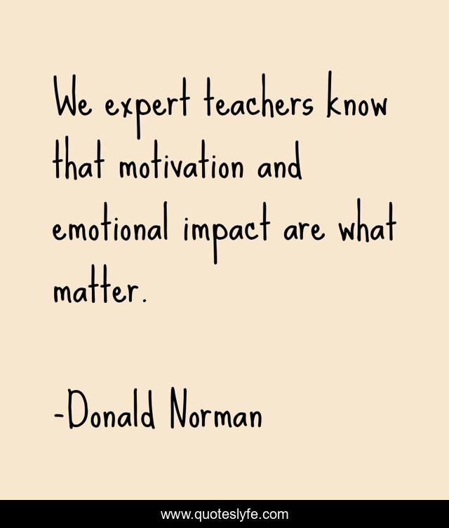 This page presents the quote "We expert teachers know that motivation and emotional impact are what matter.". Author of this quote is Donald Norman. This quote is about impact, motivation,.