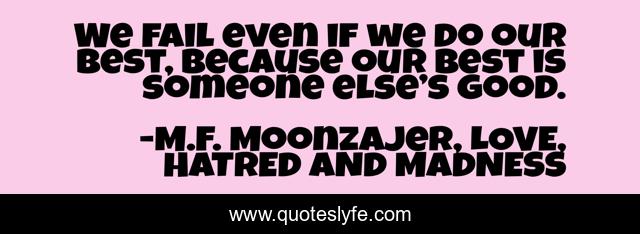 This page presents the quote "We fail even if we do our best, because our best is someone else’s good.". Author of this quote is M.F. Moonzajer, LOVE, HATRED AND MADNESS. This quote is about fail, hardworking, best, success, else,.