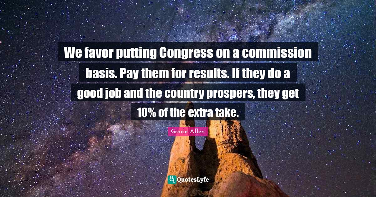 This page presents the quote "We favor putting Congress on a commission basis. Pay them for results. If they do a good job and the country prospers, they get 10% of the extra take.". Author of this quote is Gracie Allen. This quote is about favors, results, country, congress, jobs, pay, good job,.