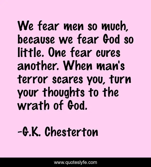 This page presents the quote "We fear men so much, because we fear God so little. One fear cures another. When man's terror scares you, turn your thoughts to the wrath of God.". Author of this quote is G.K. Chesterton. This quote is about god, fear,.
